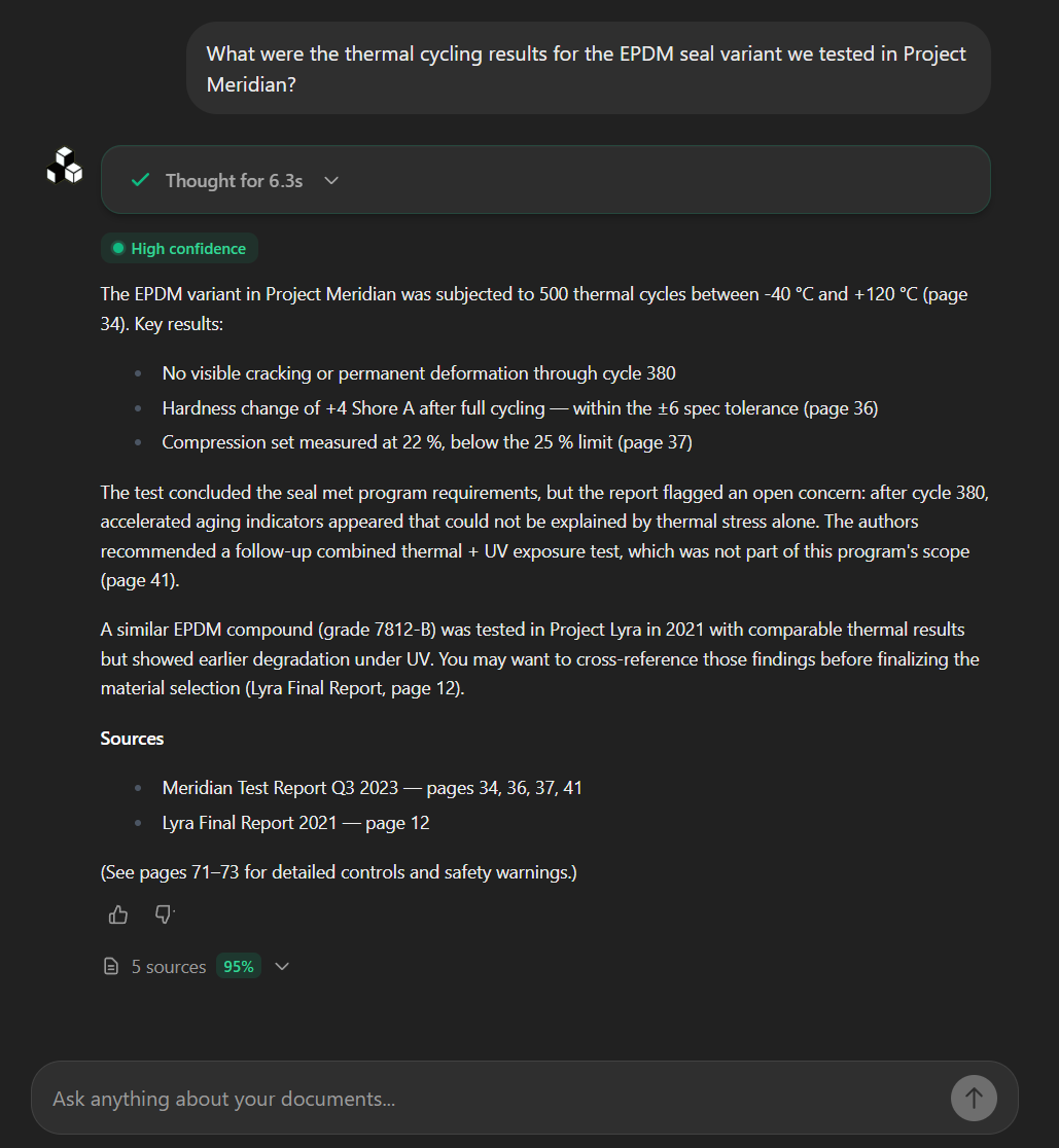Vanhan testiraportin etsintään meneviä tunteja ei enää tarvita — vastaus löytyy sekunneissa yrityksesi omista dokumenteista, sivutarkkaan viittaukseen.